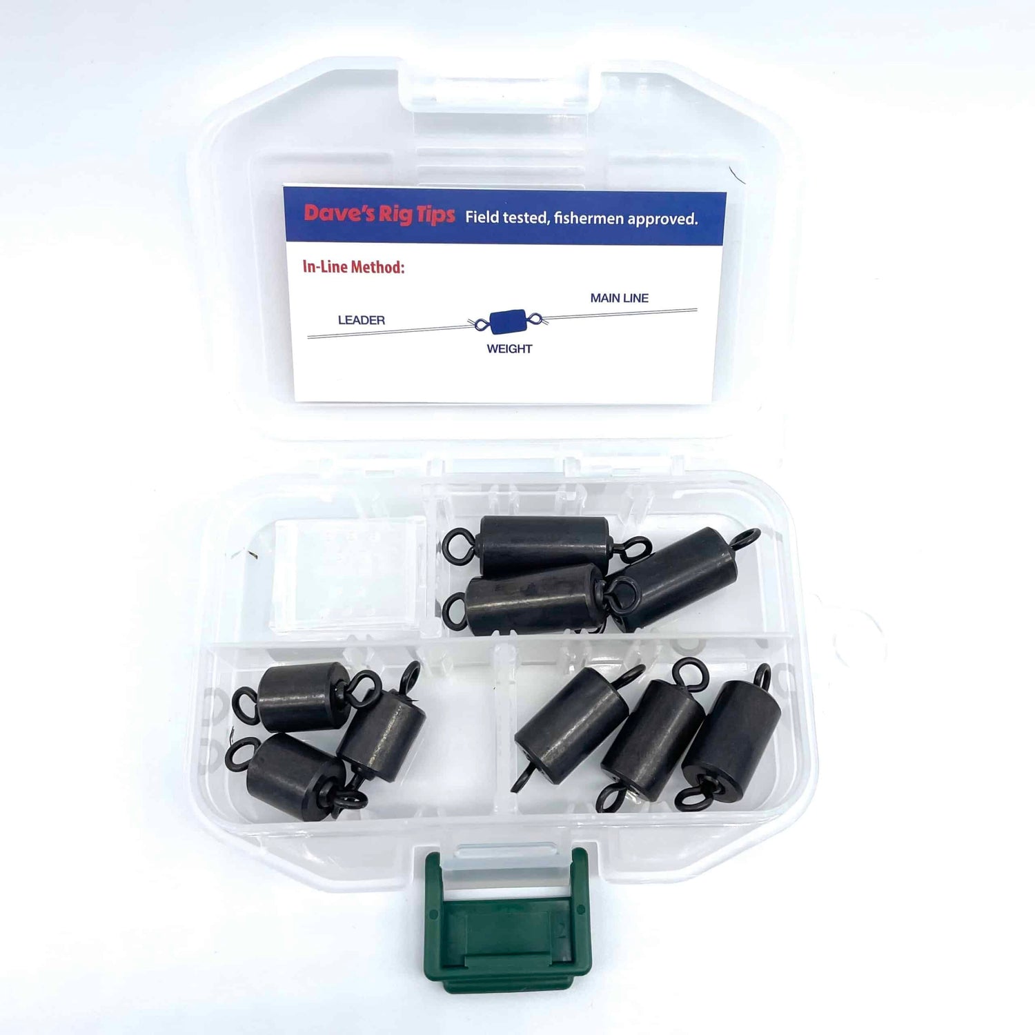 9-piece pack includes: (3) 1/4 oz, (3) 3/8 oz and (3) 1/2 oz stainless steel in-line weights. Also includes a Rig Tip on the inside cover of the sturdy case that will come in handy for years to come.