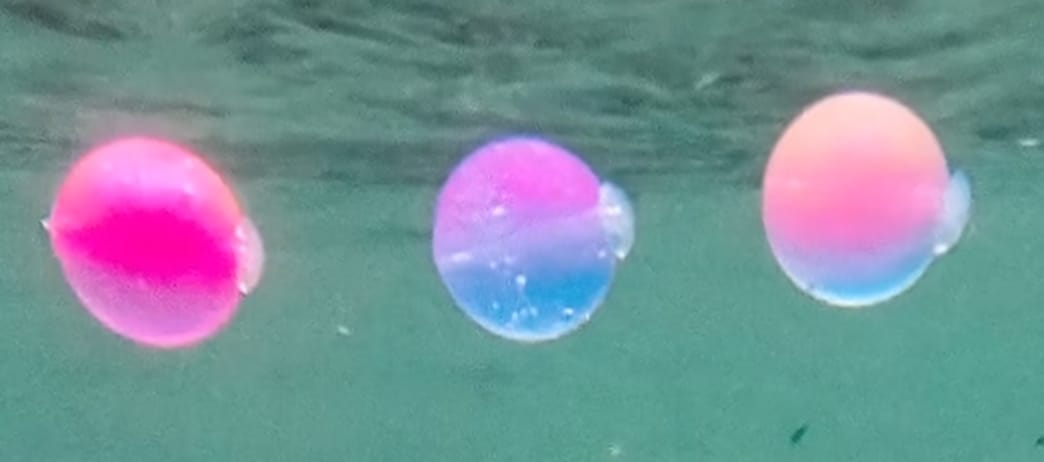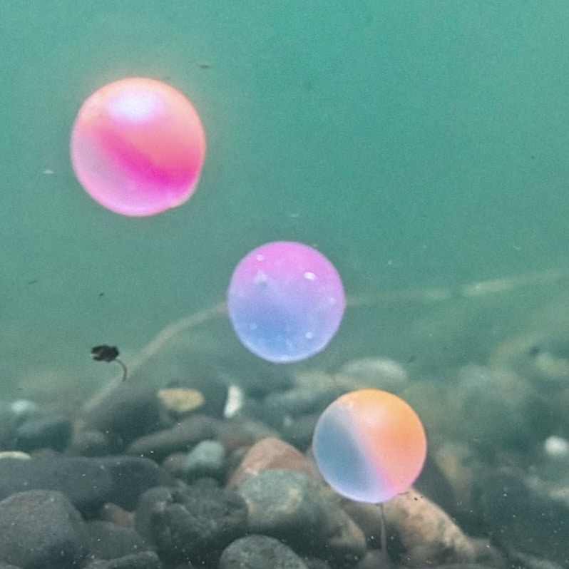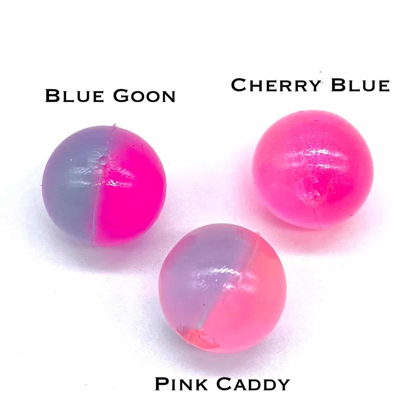 Cherry Blue took the longest in development. This is a variant of the Sweet Pink Cherry. On one half we took the SPC mix and toned down the recipes to make it more translucent, and on the other side is almost clear but just a slight hint of color with this mix of 2 different fine particle pearls. This results in a very translucent bead that has that SPC attractant that glows really bright in the water from the clearness of the side of bead.